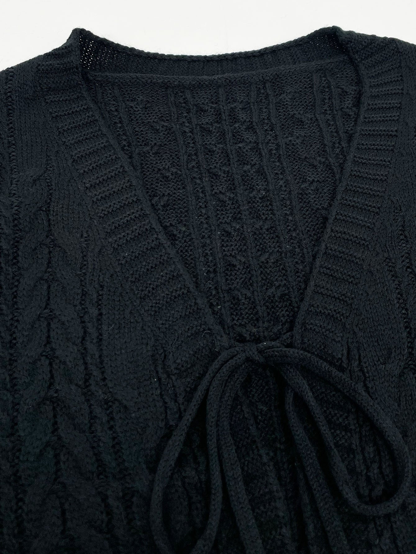 Un cardigan corto in maglia con lavorazione a trecce e scollo a V profondo, chiuso da un romantico nodo frontale. Il modello unisce comfort e femminilità, perfetto da indossare sopra top o abiti per uno stile casual ma curato. Le maniche lunghe e la morbidezza del filato lo rendono ideale per le stagioni di transizione.