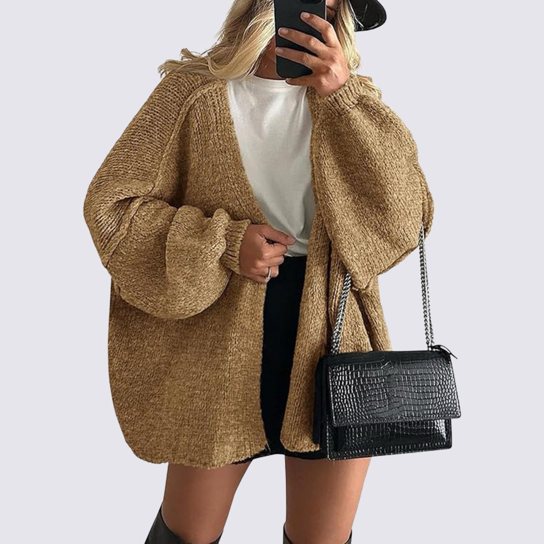Un cardigan oversize in maglia, perfetto per la stagione autunnale e invernale. Dal design morbido e avvolgente, è ideale per look casual e alla moda, facile da abbinare sia con jeans che con gonne. Il tessuto leggero ma caldo offre comfort e libertà di movimento, rendendolo un capo versatile da indossare tutti i giorni.
