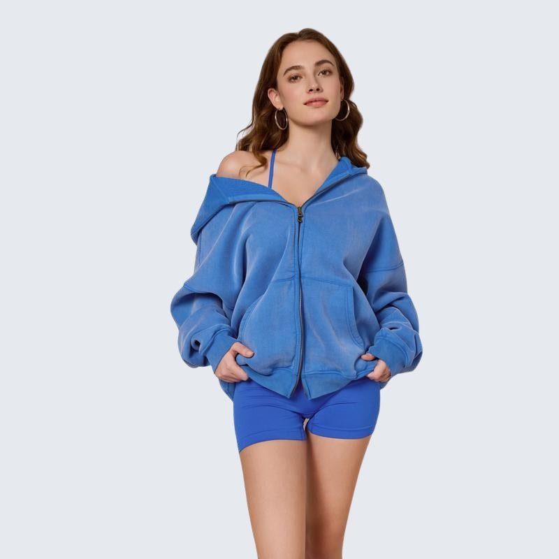 Questa felpa oversize con cappuccio e zip frontale unisce comfort e stile in un capo versatile. Realizzata in morbido tessuto misto poliestere, presenta una vestibilità ampia con spalle scese, cappuccio e pratica chiusura a zip. Le tasche frontali aggiungono funzionalità, mentre la gamma di colori disponibili consente di adattarla a ogni look casual.