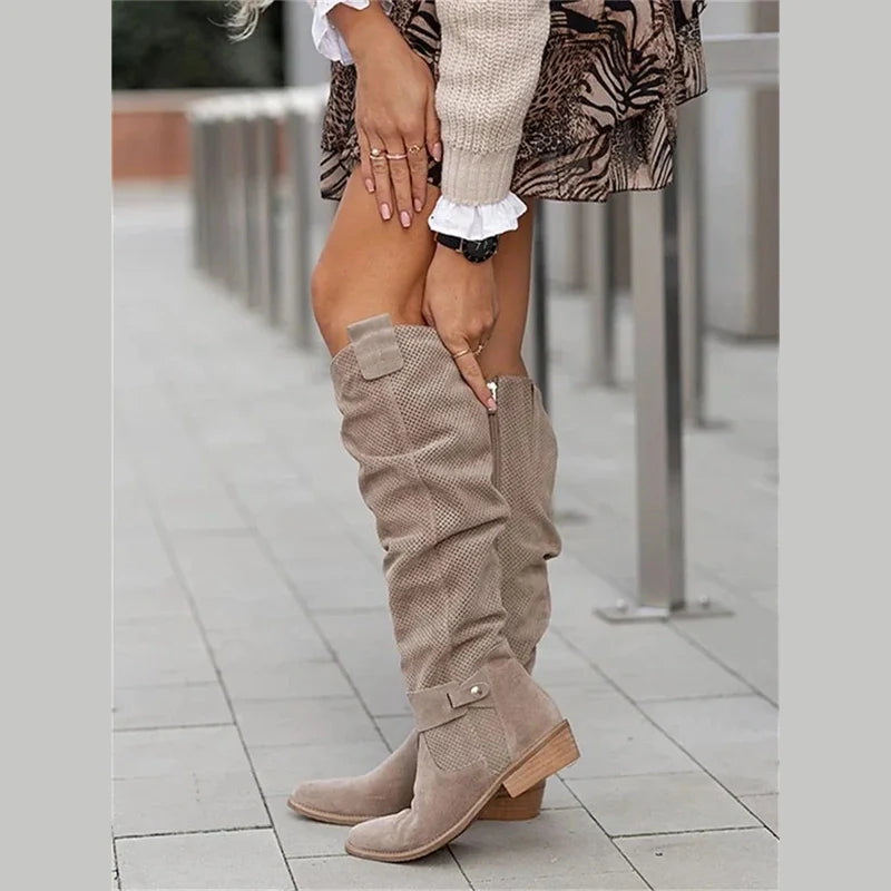 Uno spirito vintage con un tocco moderno, progettato per attirare l'attenzione ad ogni passo. Questi stivali al ginocchio fondono la libertà boho con una raffinata maestria artigianale. Realizzati in morbida pelle scamosciata, presentano un gambale morbido con una texture traforata su tutta la superficie, che conferisce loro un fascino artigianale. Il tacco basso garantisce comfort per tutto il giorno, mentre la cerniera laterale e la fibbia alla caviglia aggiungono un tocco di raffinatezza. Rifiniti con una punta affusolata, sono il perfetto equilibrio tra praticità e stile.